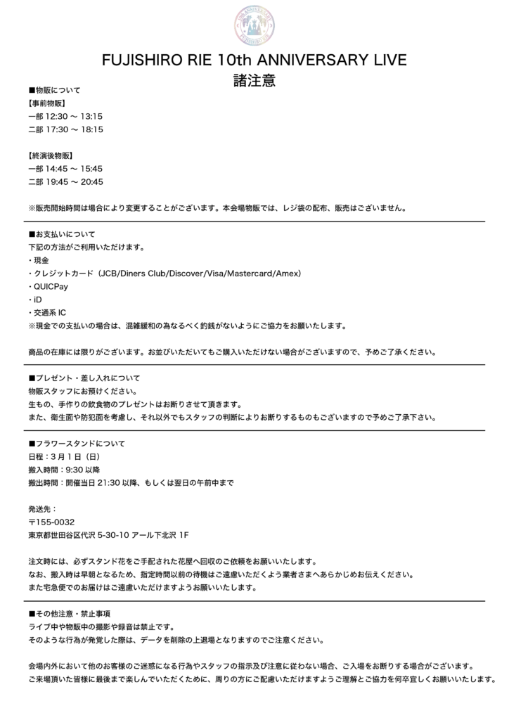 「FUJISHIRO RIE 10th ANNIVERSARY LIVE」お品書き、諸注意を公開しました!